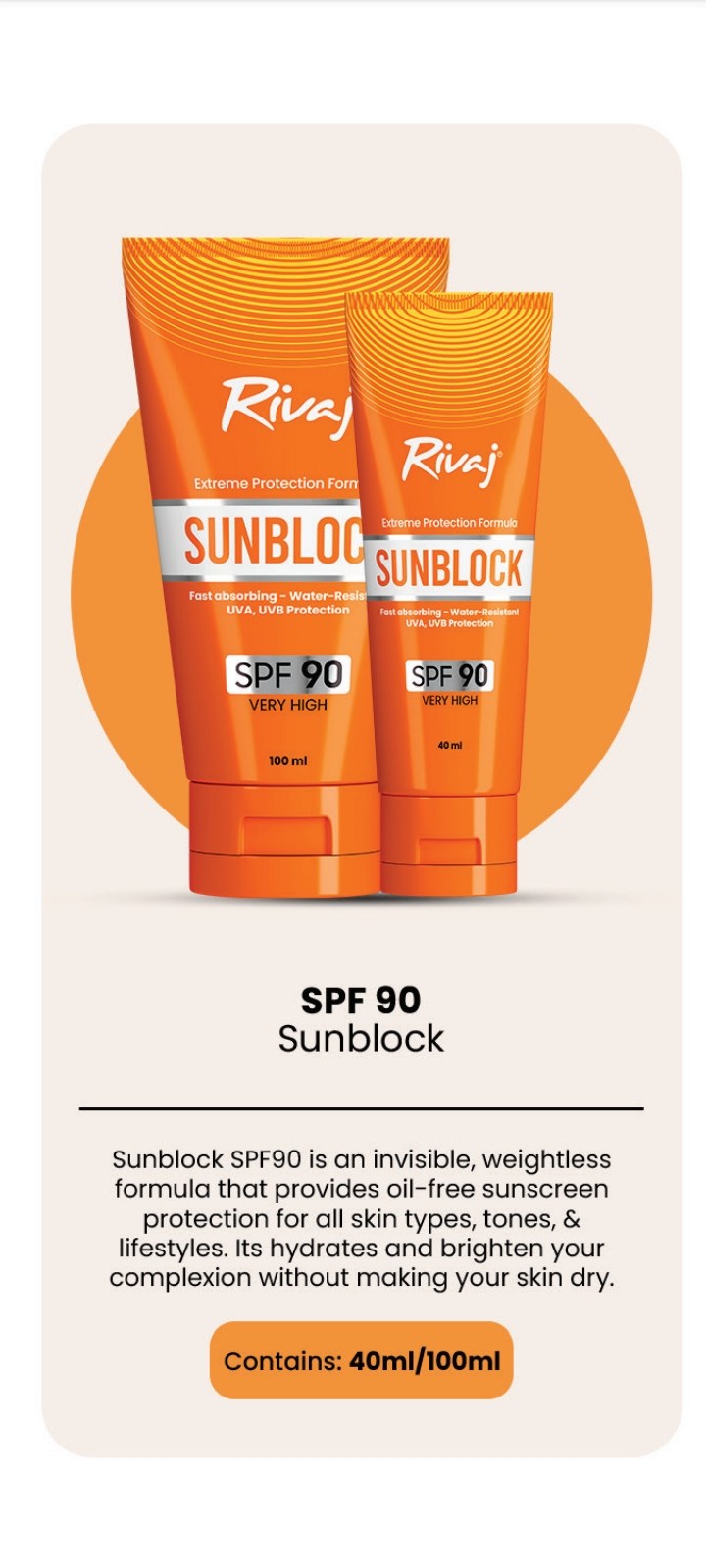 Our most popular Sunblock SPF90 is an invisible, weightless formula that provides oil-free sunscreen protection for all skin types, tones, & lifestyles. Its hydrates and brighten your complexion without making your skin dry. Feel a whole new skin experience all with Rivaj sun block, a treasure indeed to go anywhere without covering your face!